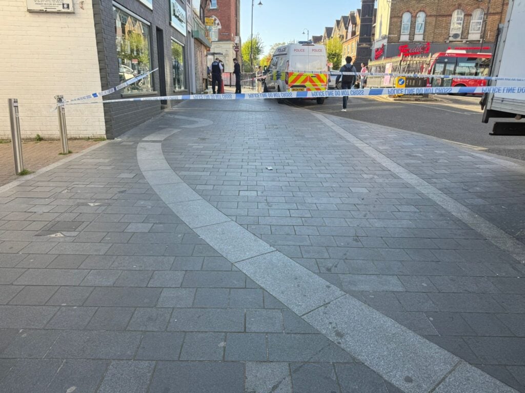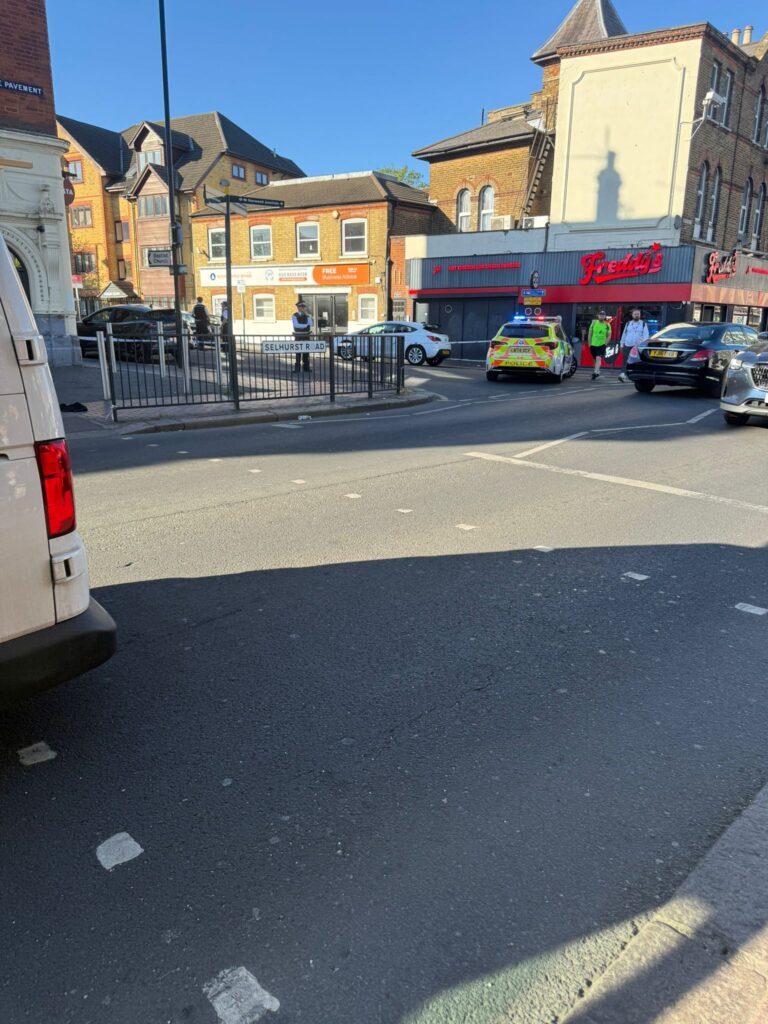 Photographs taken at the scene show Metropolitan Police officers standing guard beside cordoned-off sections of pavement and road, with a marked police van and patrol car positioned close to Freddy’s, the chicken and burger restaurant on the junction. Police tape has been stretched across the footway, restricting pedestrian access in the area.