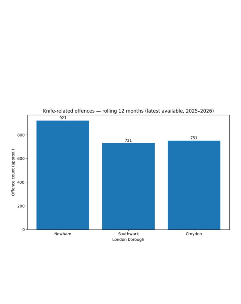 Newham recorded approximately 921 knife-enabled offences in the most recent 12-month reporting window, placing it among the highest in London by volume. Croydon logged around 751 offences across the same period, continuing a pattern of elevated levels compared with many other outer London boroughs. Southwark recorded approximately 731 offences, with several serious incidents in the borough during early 2026 adding to existing community concern.